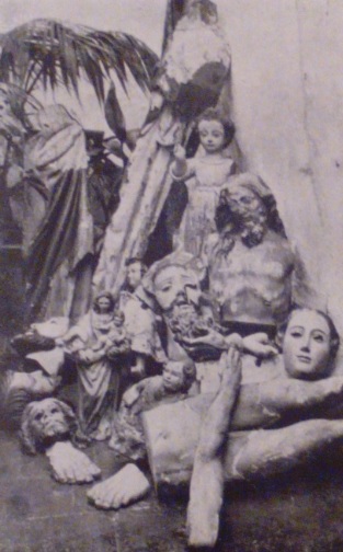 | Restos de imágenes de la Iglesia parroquial de Salobreña, tras ser recogidas de un barranco donde fueron arrojadas por los revolucionarios en 1936. |